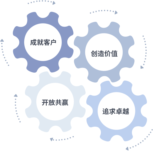 成就客户是一切决策的出发点,创造价值是衡量所有工作的标准,追求卓越是1WIN做事做人的态度,开放共赢是1WIN的格局也是最终的结果。价值观的齿轮环环相扣,推动着组织里的每个人不断向前。